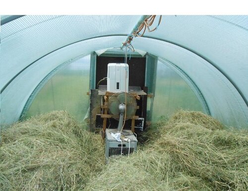 Avec la serre, l'herbe peut être mouillée : il suffit de prolonger le séchage de quelques jours. L'énergie solaire est gratuite. J'ai déjà vécu ce cas avec ma petite serre de 3 mètres sur 4 lorsqu'il avait plu sur l'herbe coupée sur la prairie, et cela avait très bien séché.