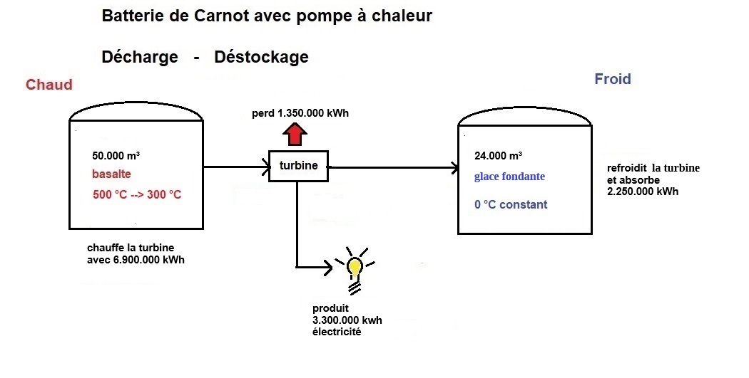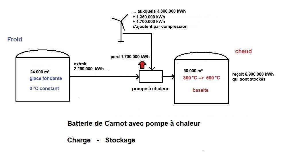Cette batterie peut également s'appeler batterie de Carnot avec pompe à chaleur. Il existe aussi des batteries de Carnot sans pompe à chaleur où on se contente de chauffer un matériau, mais elles sont beaucoup moins efficaces et nécessitent l'utilisation d'aéroréfrigérants qui peuvent causer la légionellose. Cette batterie avec pompe à chaleur est composée de 4 éléments : un réservoir chaud, un réservoir froid, une pompe à chaleur et une turbine à vapeur. Un réservoir coûte d'autant moins par rapport à ce qu'il contient qu'il est grand, car la surface d'un cube et donc la quantité de matériaux à acheter pour le fabriquer est proportionnelle au carré de son côté, tandis que son volume et donc la quantité d'énergie qu'il peut contenir est proportionnelle au cube de son côté. Cette batterie est donc particulièrement indiquée pour stocker de très grandes quantités de kWh. Il existe à Krems, en Autriche, un stockage de chaleur dans un grand réservoir d'eau de 50 000 m³ pour le chauffage urbain d'une capacité de 2.000.000 KWh. Wikipedia nous montre une photo de ce réservoir : https://fr.wikipedia.org/wiki/Accumulateur_thermique